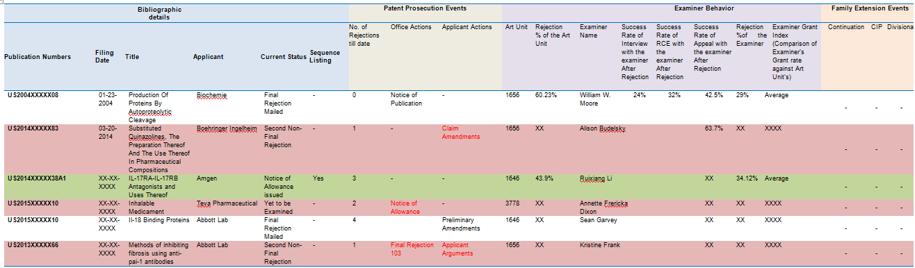 This represents some value-added information from our proprietary Examiner Analysis tool. Each report highlights circumstances specifically related to the examiner of the targeted application, enabling you to see how that examiner previously handled similar patent applications. Discovering data on RCE turnaround time, allowance rates, and appeal process outcomes helps understand and predict an examiner’s arbitration behavior and rejection rate. You will know beforehand which patent applications of your competitors are going to get rejected and which