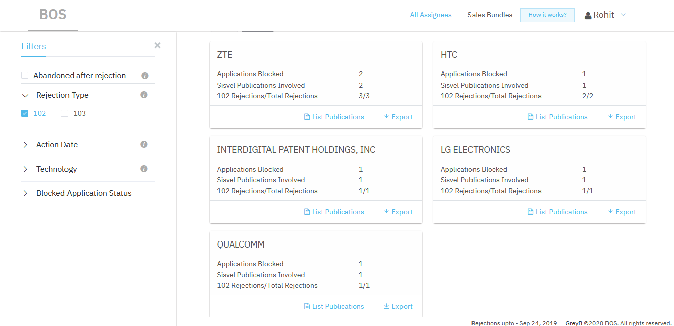 To find more insights on these patents, we analyzed these 9 patents on our BOS tool. What we observed in the output was quite interesting. The following companies were found out to be blocked (i.e. were rejected under 102/103 by the examiner) by these 9 patents –