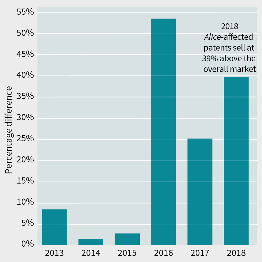 The report reflects that packages from technology categories affected by the Supreme Court decision and listed in 2016 are 53% more likely to sell than packages in the overall market. It seems that the broader fear of Alice has subsided. Buyers and sellers have figured out a different perspective to look at patents in Alice affected technologies.