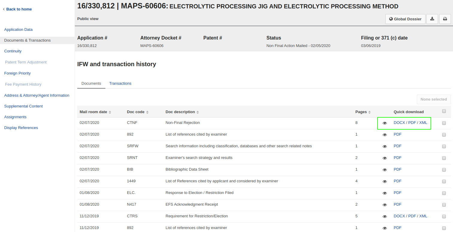 - Documents & Transactions – contains the prosecution history of the patents and IFWs associated with it. Most importantly, CTNF/CTFR files are also available in DOCX and XML format.