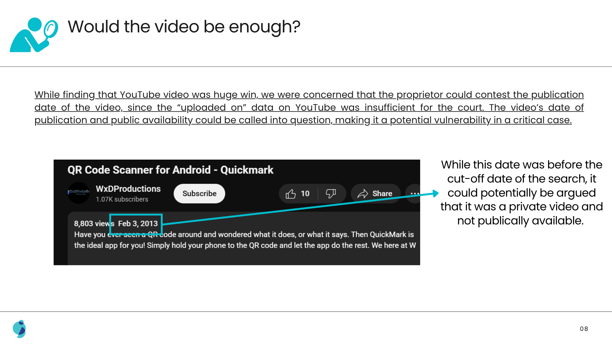 A YouTube video by WxD Production uploaded on February 3, 2013, was quickly identified as Tier 1 prior art. However, the key challenge was to confirm the public availability of this video through alternative sources.