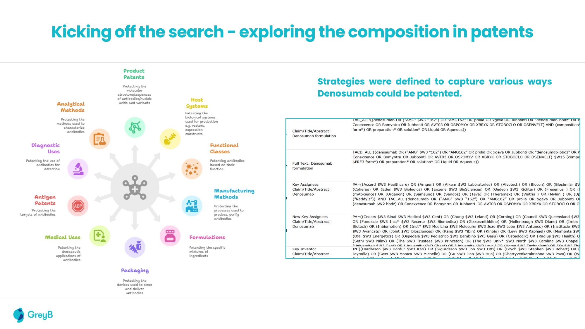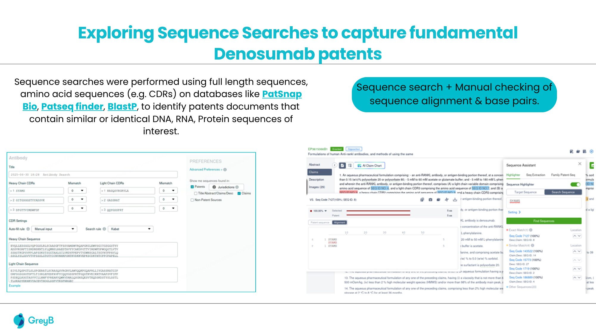 These efforts identified several publications directly claiming denosumab antibodies, and functional class-based, composition-of-matter (COM) patents like (WO 03/002713) covering Denosumab’s sequence. However, these conventional methods failed to detect indirect blocking patents, particularly those that did not mention Denosumab or its sequence yet restricted its manufacture or formulation.