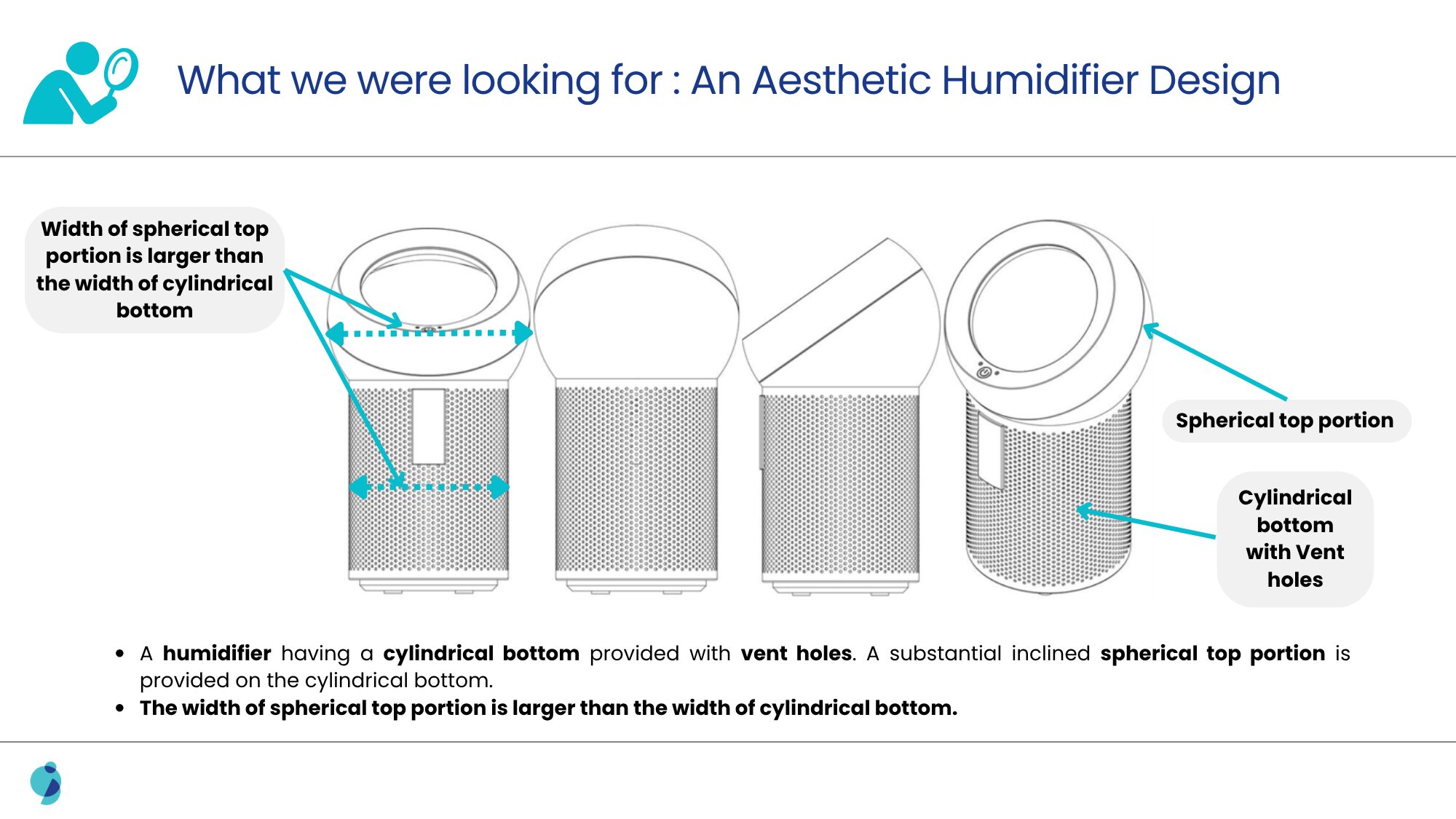 The humidifier design patent featured a cylindrical base with vent holes that had an inclined spherical top portion with a larger width than the bottom.
