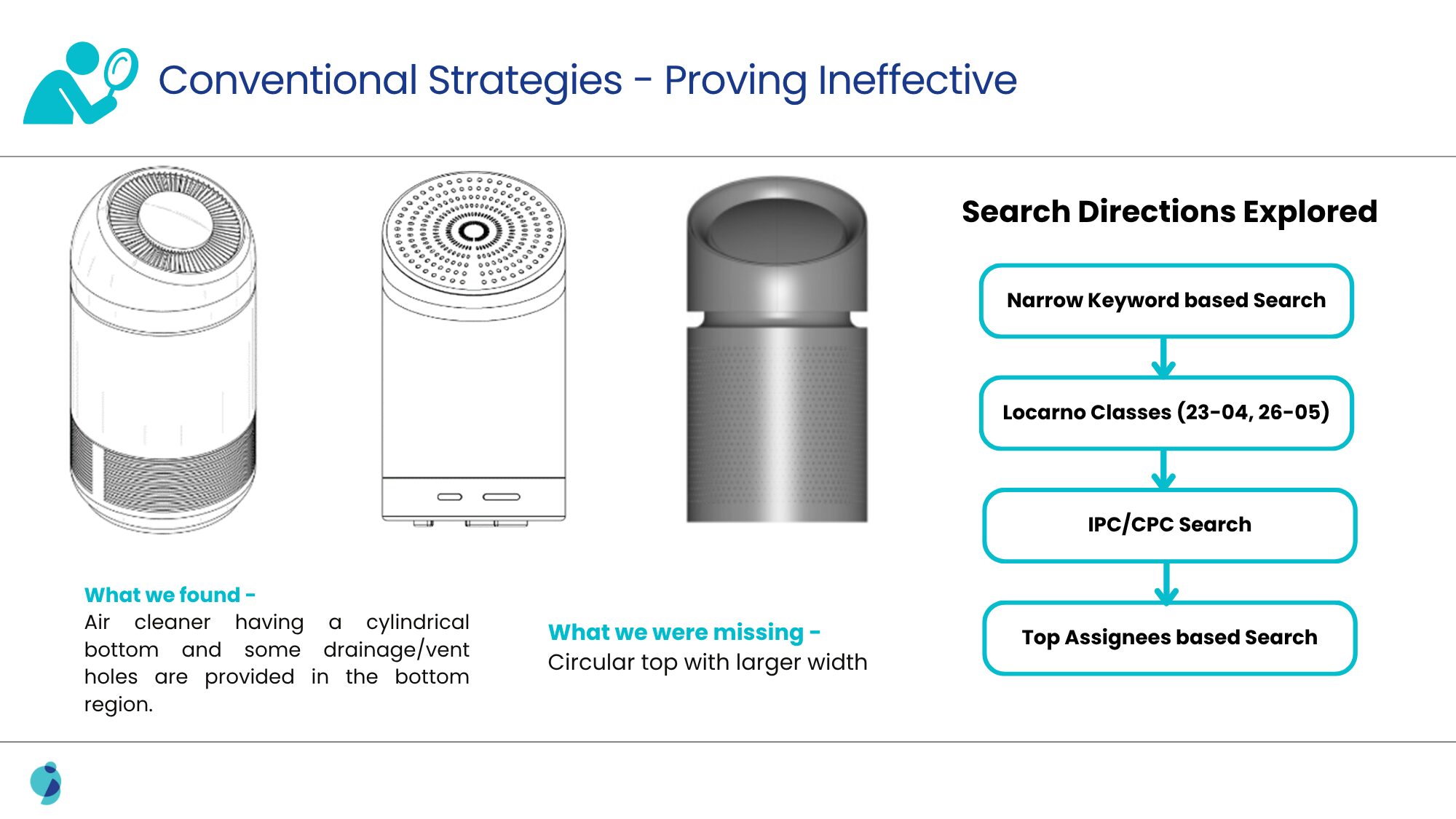 Despite exhaustive searches across Locarno, IPC, and CPC classifications, as well as investigations into top appliance manufacturers, no prior art captured all design elements. Conventional methods repeatedly failed to uncover the unique width differential of the patented design.