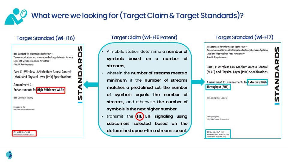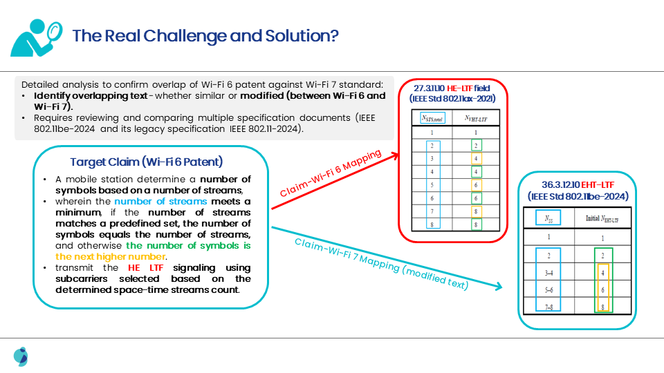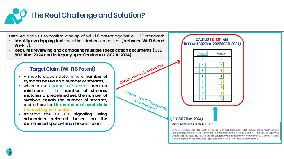 The client sought to expand their Wi-Fi 7 portfolio; they needed clarity on whether their Wi-Fi 6 patents remained applicable to the new standard. Traditional keyword-based reviews were insufficient due to differences in terminology and structural changes between HE and EHT specifications.