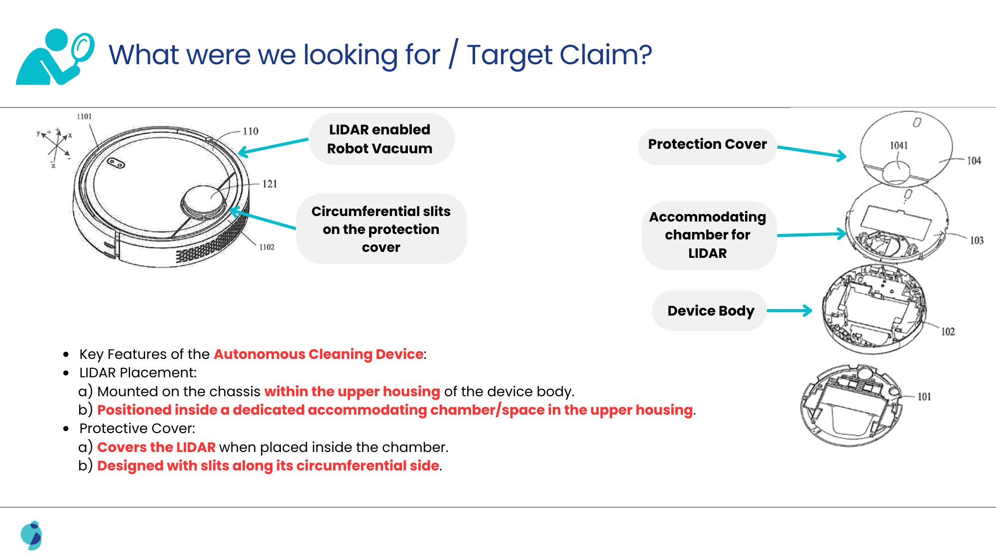 The disputed patent centered on the structural configuration of a robot vacuum chassis with a top-mounted LIDAR unit. The claimed arrangement included an upper chassis body with a dedicated LIDAR chamber, along with a protective cover. It featured circumferential slits to enable sensor operation while shielding the unit.