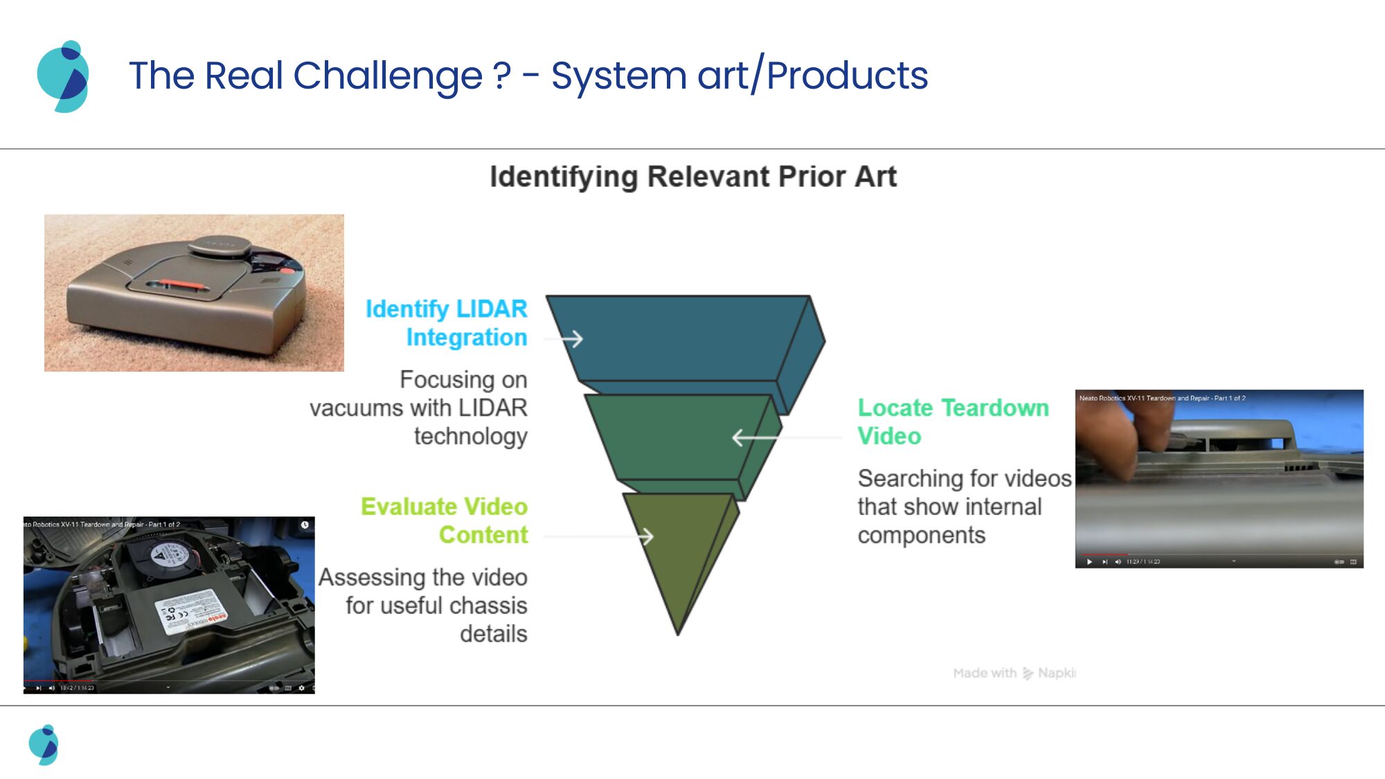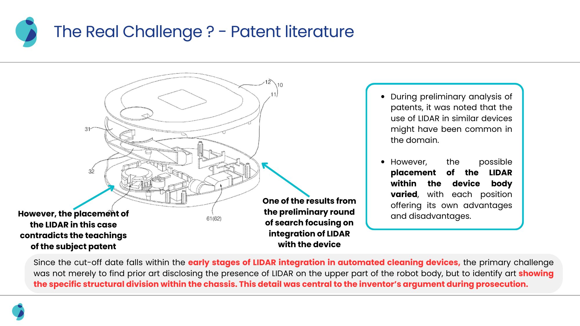 Conventional searches mainly found prior art related to navigation software and sensor integration, but they offered little insight into the underlying mechanical design. This created a critical gap in the client’s defense.