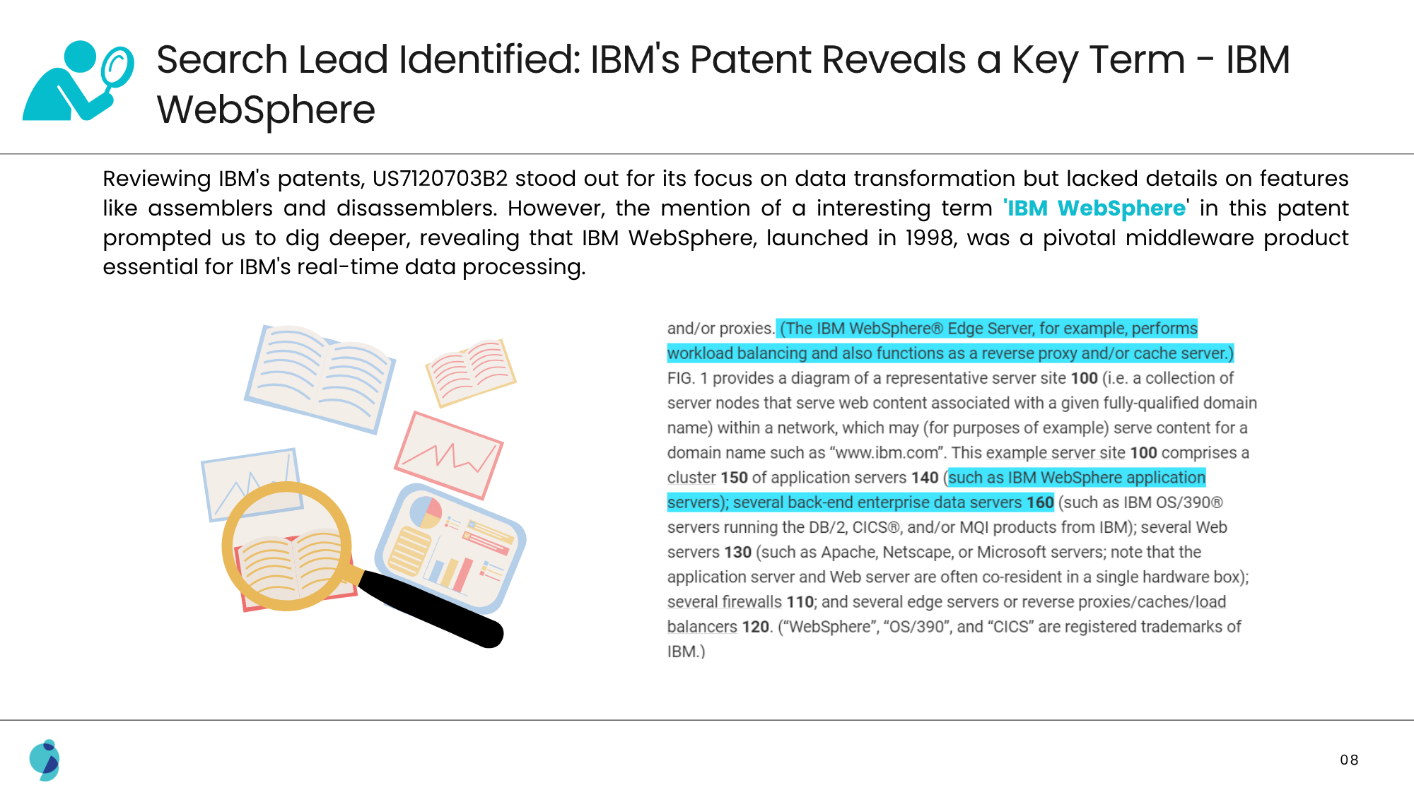 This prompted a focused review of IBM’s portfolio. One notable patent, US7120703B2, addressed data transformation, but lacked detailed disclosures on key features like assemblers and disassemblers. However, a reference to IBM WebSphere within the patent sparked deeper investigation.