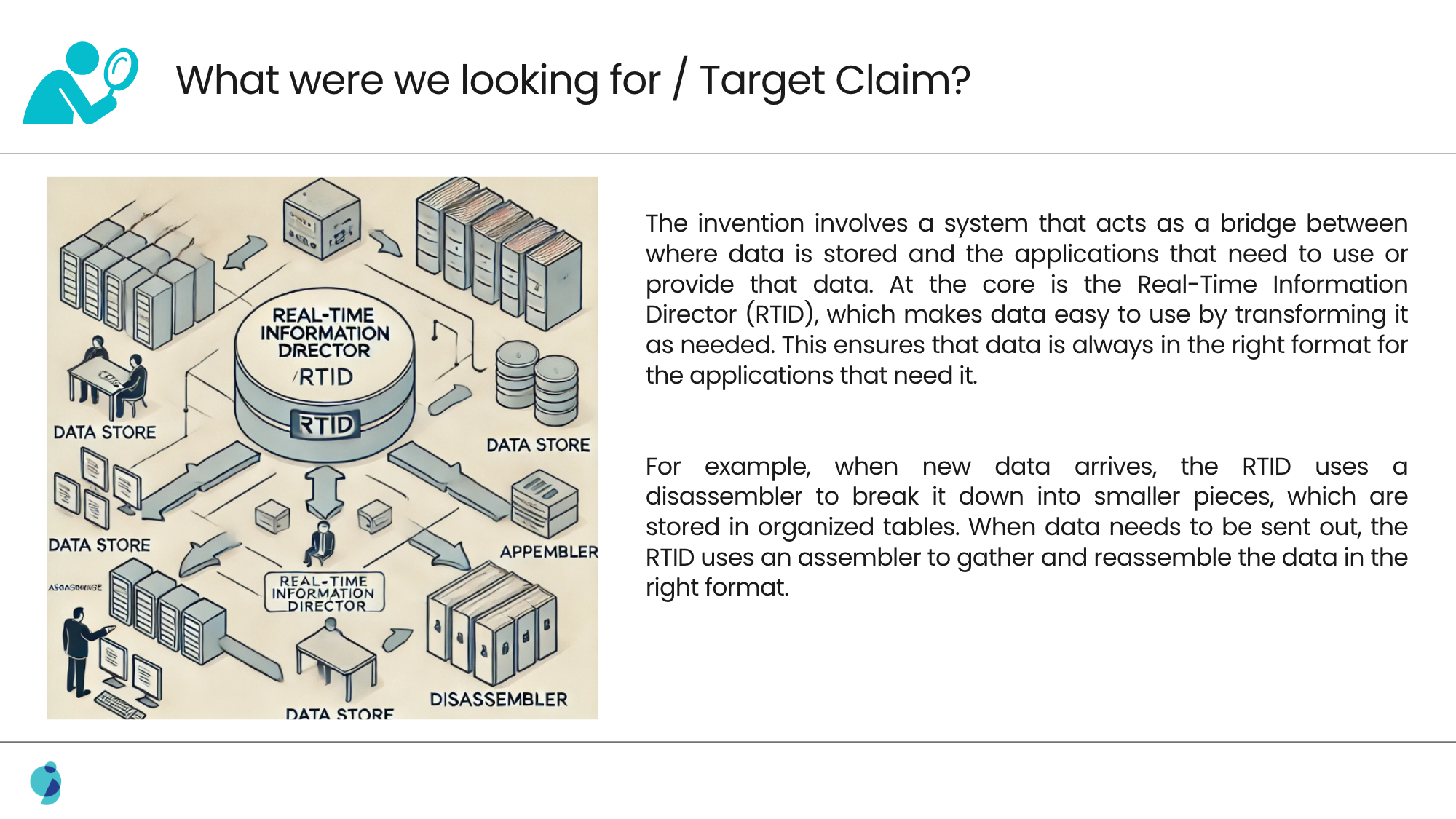 The client was seeking prior art for a Real-Time Information Director (RTID)—a system designed to bridge data storage and the applications that consume or supply that data. RTID ensures that the data it is always in the right format for the target applications.