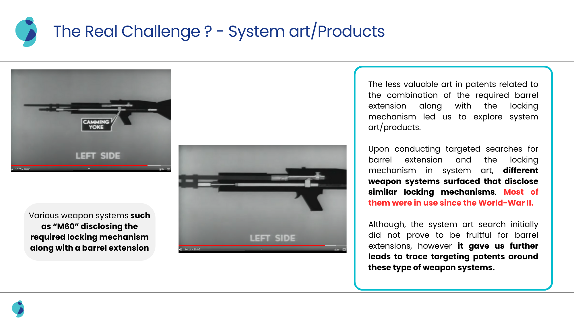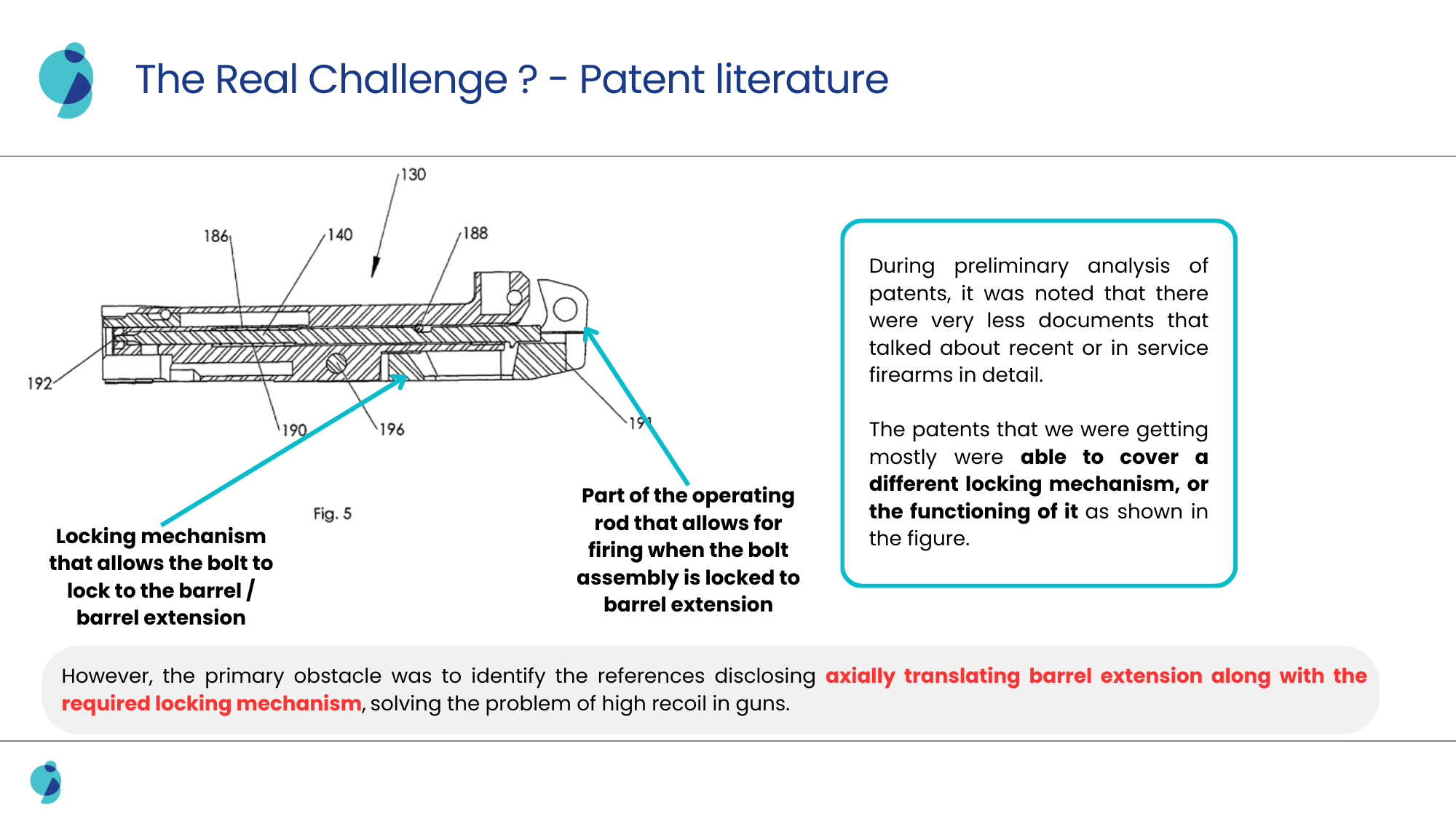 Identifying prior art for a firearm locking mechanism was initially expected to be straightforward due to its widespread use in firearms. However, despite focused searches in patent literature, finding directly relevant references proved to be a challenge. Even after narrowing the scope and expanding to system art sources—such as teardown analyses and commercially available firearm reviews—the results were limited, with only a handful of references emerging. This inability to identify precise prior art created a critical gap in the search strategy, requiring an alternative approach to uncover relevant disclosures.